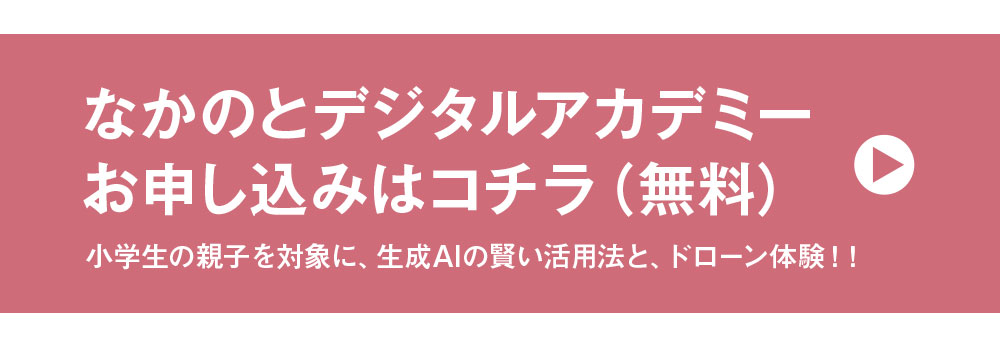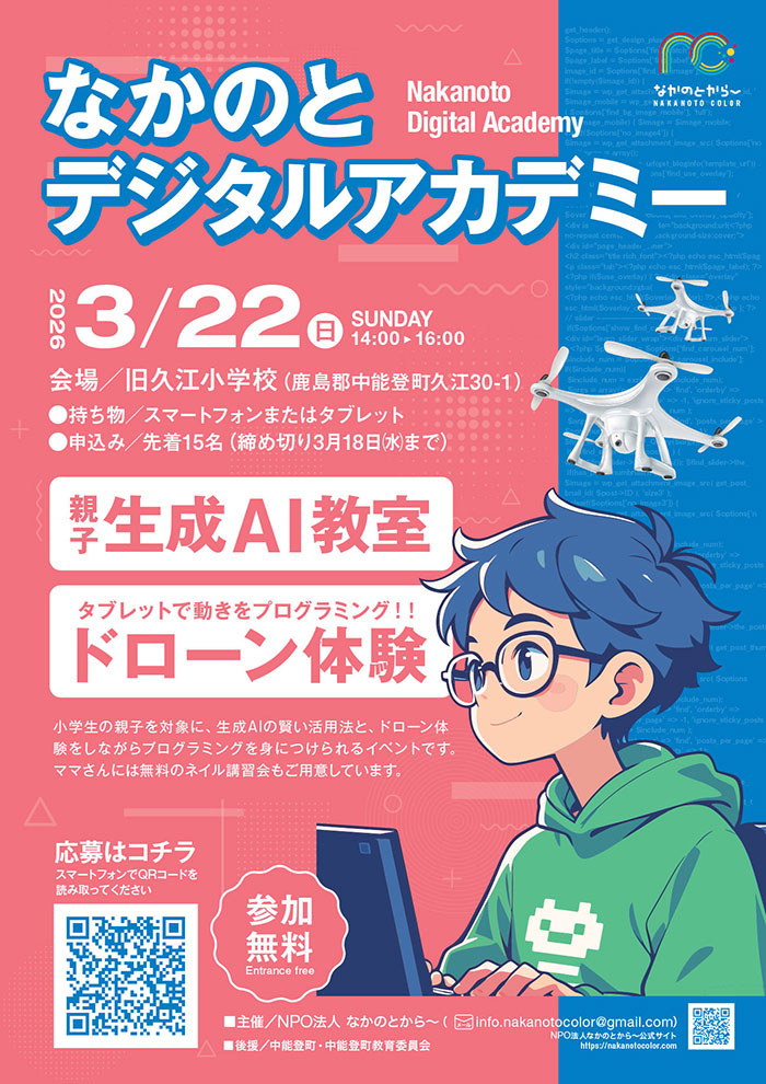 2026年3月22日㈰14:00~16:00、中能登町の旧久江小学校で「なかのとデジタルアカデミー(参加無料)」が開催されます。参加ご希望の方は下のバナーをクリックしてください。なお応募人数は小学生15名で、応募人数に達し次第、締め切りとなりますのでご容赦ください。同伴の保護者の方にはプロのネイルデザイナーがネイルのデザインや爪手肌の相談を無料で行います。